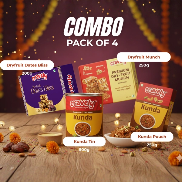🌟 Grand Celebration Combo – Dryfruit Munch (250g) + Kunda Pouch (250g) + Kunda Tin (500g) + Dryfruit Dates Bliss (200g) 🌟